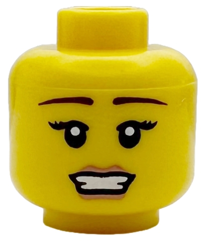 Minifigure, Head Female Reddish Brown Thin Eyebrows, Black Long Eyelashes, Nougat Lips, Open Mouth Smile with Teeth Pattern