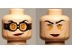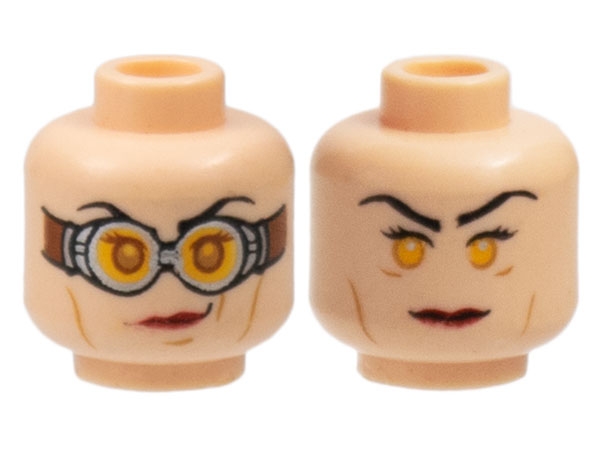Minifigure, Head Dual Sided Female Black Long Eyebrows, Eyelashes, Medium Nougat Cheek Lines, Red Lips, Smirk, Chin Dimple and Silver Goggles with Reddish Brown Strap / Neutral and Bright Light Orange Eyes Pattern