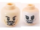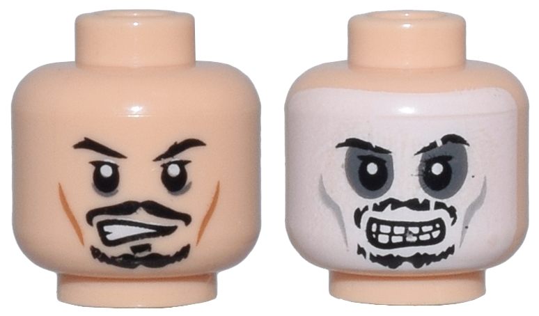 Minifigure, Head Dual Sided Black Eyebrows, Moustache, Soul Patch and Goatee, Upper Eyelids, Dark Bluish Gray Eye Shadow, Cheek Lines, Lopsided Open Mouth Scowl / White Face and Smile with Teeth Pattern
