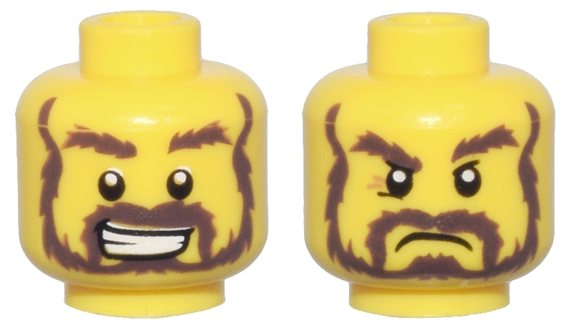 Minifigure, Head Dual Sided Dark Brown Bushy Eyebrows, Moustache and Full Beard, Lopsided Open Mouth Smile with Teeth / Upper Eyelids and Angry Frown Pattern