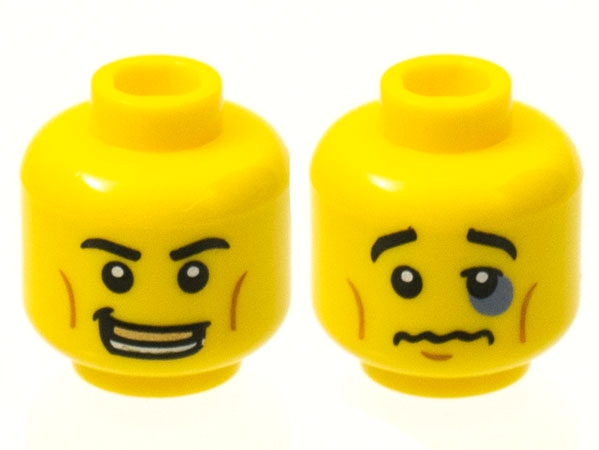 Minifigure, Head Dual Sided Black Eyebrows, White Pupils, Open Smile with Gold Mouth Guard / Black Eye, Crooked Lips Sad Pattern