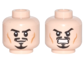 Minifigure, Head Dual Sided Black Eyebrows, Trimmed Moustache and Goatee, Medium Nougat Cheek Lines, Determined Grin / Angry Bared Teeth Pattern