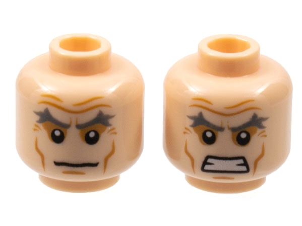 Minifigure, Head Dual Sided Dark Bluish Gray Bushy Eyebrows, Medium Nougat Wrinkles and Cheek Lines, Neutral / Bared Teeth Pattern