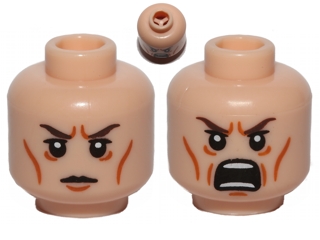 Minifigure, Head Dual Sided Dark Brown Eyebrows, Medium Nougat Cheek Lines, Angry / Open Scowl Pattern