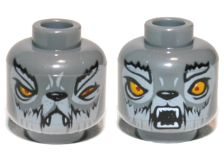 Minifigure, Head Dual Sided Alien Wolf with Light Bluish Gray Eyebrows and Fur, Bright Light Orange Eyes, Black Nose, Neutral with Fangs / Open Mouth with Teeth Parted Pattern