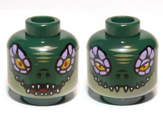 Minifigure, Head Dual Sided Alien Chima Crocodile with Bright Light Orange Eyes, Olive Green Lower Jaw, Medium Lavender Scales, and White Sharp Teeth, Open / Closed Mouth Pattern