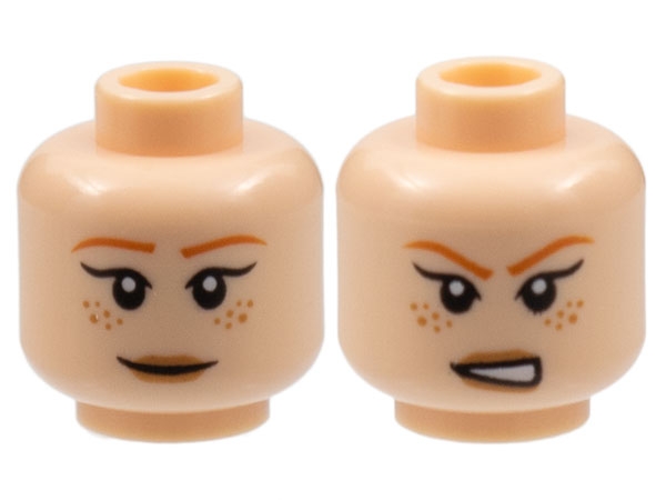 Minifigure, Head Dual Sided Female Dark Orange Eyebrows, Freckles, Tan Lips, Closed Mouth Smile / Open Mouth Scowl Pattern