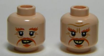 Minifigure, Head Dual Sided LotR Dark Orange Moustache, Goatee, Bushy Eyebrows, Wrinkles, Yellowed Teeth, Smile / Open Mouth Pattern