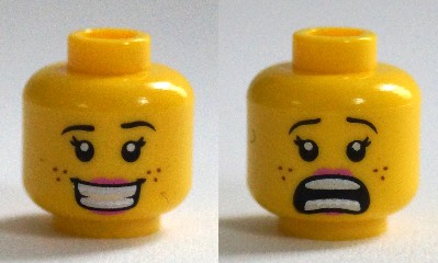 Minifigure, Head Dual Sided Female Brown Eyebrows, Freckles, Eyelashes, Peach Lips, Smile with Teeth / Scared Open Mouth Pattern