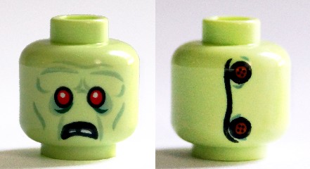 Minifigure, Head Alien Zombie, Red Eyes, Frowning, Broken Teeth, Stitching and 2 Buttons on Back Pattern