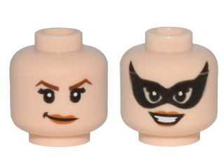 Minifigure, Head Dual Sided Female Dark Brown Pointed Eyebrows, Smirk / Black Eye Mask Pointed, Smile Pattern (Catwoman)