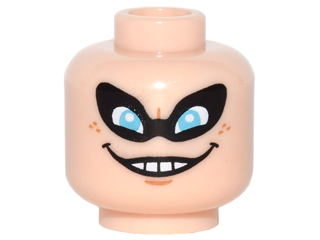 Minifigure, Head Black Eye Mask with Holes over Medium Azure Eyes, Nougat Chin Dimple and Freckles, Evil Wide Open Mouth Smile with Teeth Pattern
