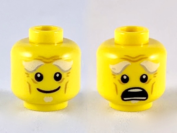 Minifigure, Head Dual Sided White Bushy Eyebrows, Goatee, Wrinkles, Smile / Open Mouth Scared Pattern