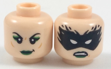 Minifigure, Head Dual Sided Female Black Eyebrows, Green Lips, Smirk with Green Eye Shadow / Black Eye Mask with White Eye Holes Pattern