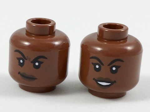 Minifigure, Head Dual Sided Female, Black Eyebrows, Dark Brown Lips, Lopsided Smirk / Smile Pattern
