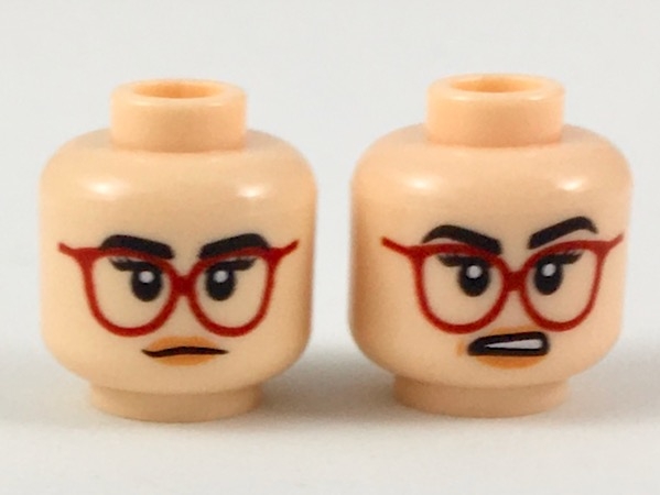 Minifigure, Head Dual Sided Female Black Eyebrows, Red Glasses, Peach Lips, Neutral / Surprised Expression Pattern
