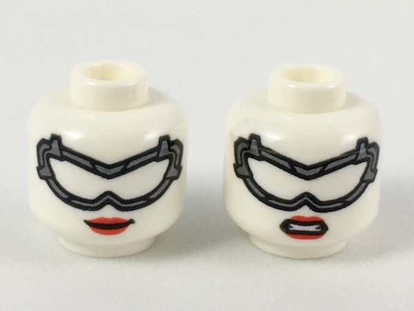 Minifigure, Head Dual Sided Female Dark Silver Goggles with Black Outlines, Red Lips, Smile / Gritted Teeth Pattern