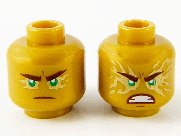 Minifigure, Head Dual Sided Reddish Brown Eyebrows and Mouth, Green Eyes with Gold Energy Effect, Frown / Fierce Outburst Pattern