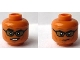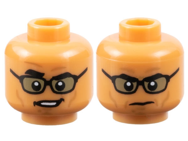 Minifigure, Head Dual Sided Black Thick Eyebrows, Glasses with Dark Tan Lenses, Medium Nougat Cheek Lines, Chin Dimple, and Wrinkles, Lopsided Open Mouth Smirk with Teeth / Stern Pattern