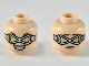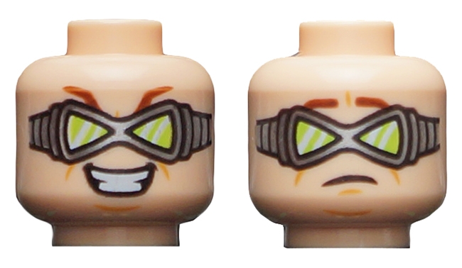 Minifigure, Head Dual Sided Reddish Brown Eyebrows, Silver Goggles with Lime Triangular Lenses, Evil Grin / Worried Expression Pattern