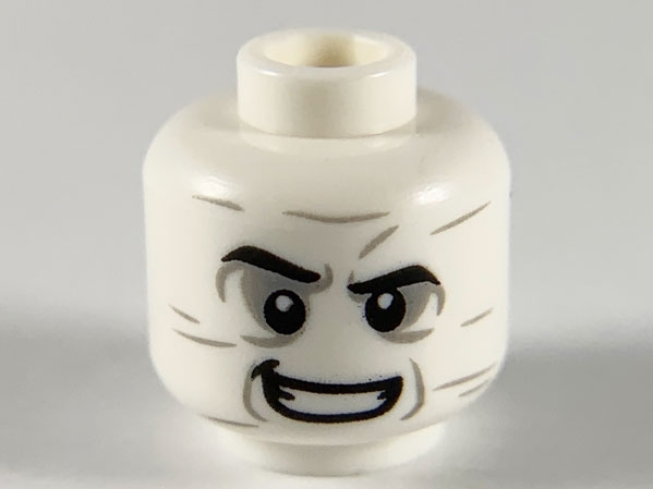 Minifigure, Head Black Eyebrows, Light Bluish Gray Wrinkles and Eye Shadow, Lopsided Grin Pattern