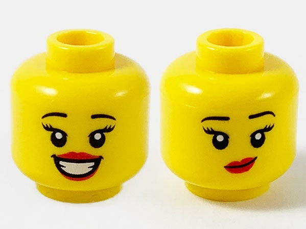 Minifigure, Head Dual Sided Female, Black Eyebrows, Red Lips, Large Smile Showing Teeth / Small Lopsided Grin Pattern