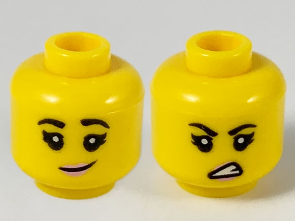 Minifigure, Head Dual Sided Female, Black Eyebrows, Bright Pink Lips, Lopsided Grin / Sneer Pattern