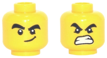 Minifigure, Head Dual Sided Black Thick Eyebrows and Eyes with White Pupils with Smirk / Angry with Bared Teeth Pattern