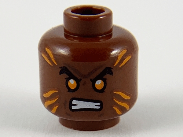 Minifigure, Head Orange Diagonal Stripes, Black Eyebrows, Orange Eyes, Gritted Teeth Pattern
