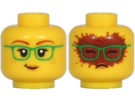 Minifigure, Head Dual Sided Female, Dark Red Eyebrows, Green Glasses, Peach Lips, Freckles, Lopsided Grin / Covered with Cocoa Pattern