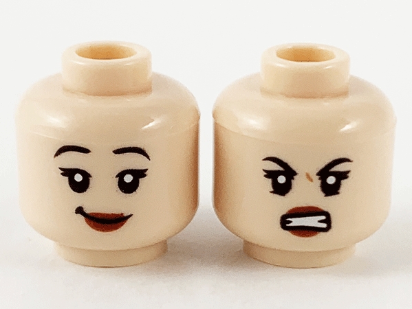 Minifigure, Head Dual Sided Female, Black Eyebrows, Dark Red Lips, Smile, Scowl with Teeth Pattern