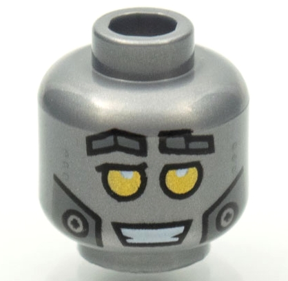 Minifigure, Head Robot Dark Silver Eyebrows, Dots, and Cheek Panels, Gold Eyes, Open Mouth Smile with Teeth Pattern
