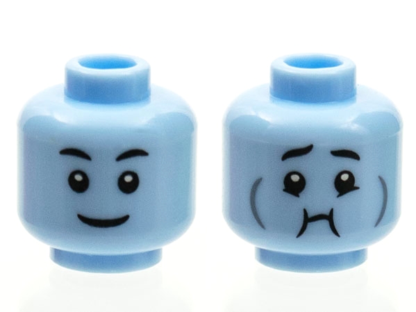 Minifigure, Head Dual Sided Black Eyebrows, Grin / Queasy with Dark Bluish Gray Cheek Lines Pattern (BAM)