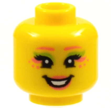 Minifigure, Head Female Coral Eyebrows, Dots and Lips, Black Eyelashes, Lower Eyelids, Lime Eye Shadow, Open Mouth Smile with Teeth Pattern