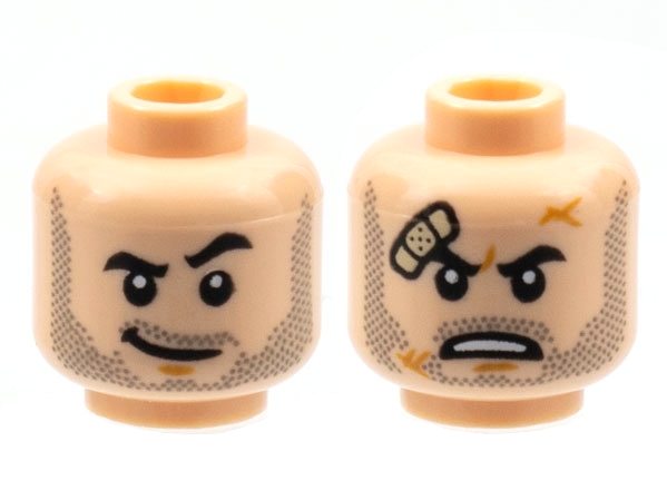 Minifigure, Head Dual Sided Black Eyebrows, Dark Bluish Gray Stubble, Grin with Raised Eyebrow / Scowl with Bandage Pattern