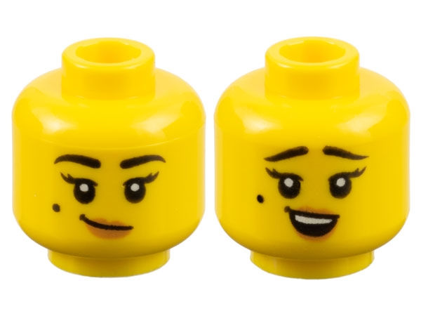 Minifigure, Head Dual Sided Female Black Eyebrows and Beauty Mark, Medium Nougat Lips, Lopsided Grin / Surprised Open Mouth with Top Teeth Pattern