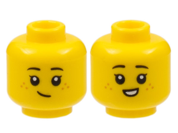 Minifigure, Head Dual Sided Child Female Black Eyebrows, Medium Nougat Freckles, Lopside Grin / Small Smile with Teeth Pattern