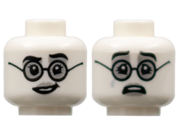 Minifigure, Head Dual Sided Female, Black Eyebrows and Glasses, Light Bluish Gray Lips, Lopsided Grin / Sad with Tear Pattern