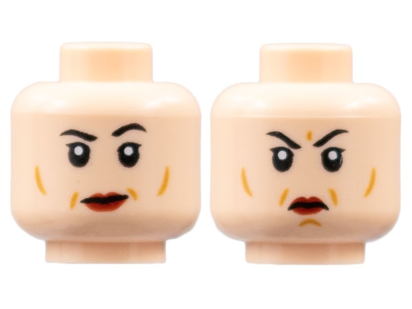 Minifigure, Head Dual Sided Female Black Eyebrows, Dark Red Lips, Medium Nougat Contour Lines, Small Smile / Scowl Pattern