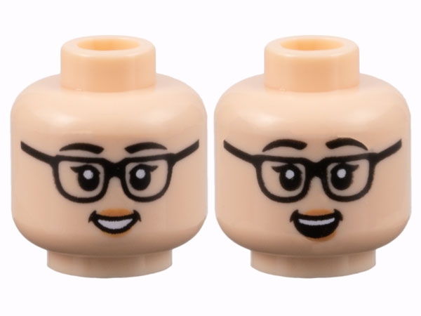 Minifigure, Head Dual Sided Female, Black Eyebrows and Glasses, Peach Lips, Grin with Teeth / Open Mouth Smile Pattern