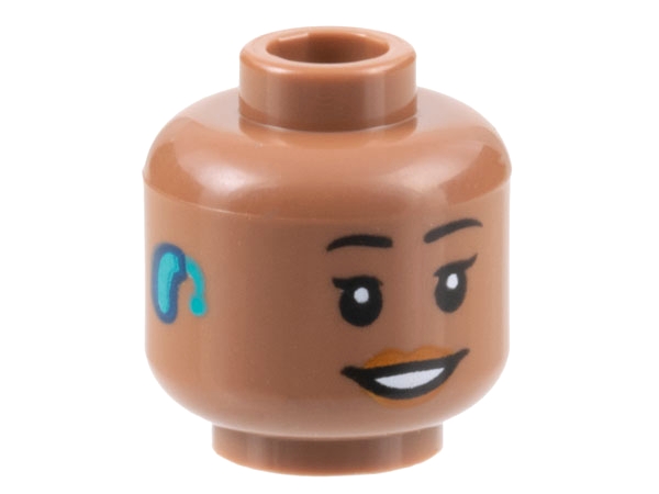 Minifigure, Head Female Black Thin Eyebrows, Single Eyelashes, Dark Orange Lips, Dark Turquoise Hearing Aid on Right, Open Mouth Smile with Teeth Pattern