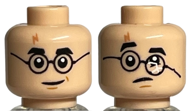 Minifigure, Head Dual Sided Medium Nougat Lightning Scar, Black Eyebrows, Glasses Round, Chin Dimple, Smirk / Frown with Broken Glasses Pattern