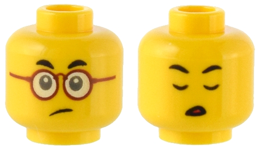 Minifigure, Head Dual Sided Small Black Eyebrows, Dark Red Glasses, Sad / Eyes Closed Pattern