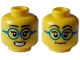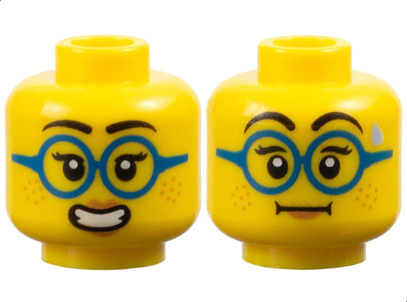 Minifigure, Head Dual Sided Female Black Eyebrows, Eyelashes, Dark Azure Glasses, Nougat Freckles and Lips, Open Mouth Smile with Teeth / Neutral with Sweat Drop Pattern