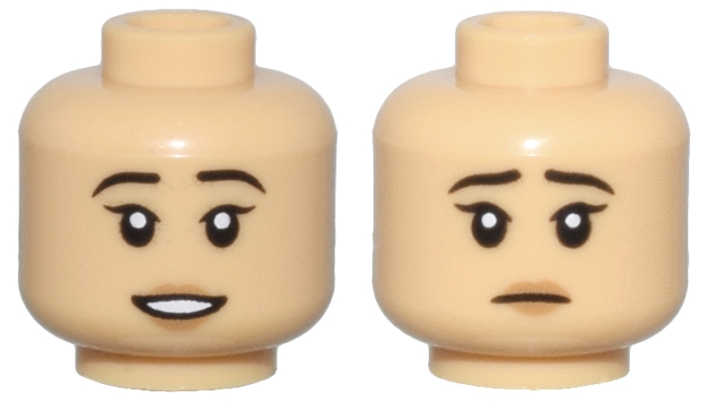 Minifigure, Head Dual Sided Female Black Eyebrows, Medium Nougat Lips, Open Mouth Smile with Teeth / Sad Pattern