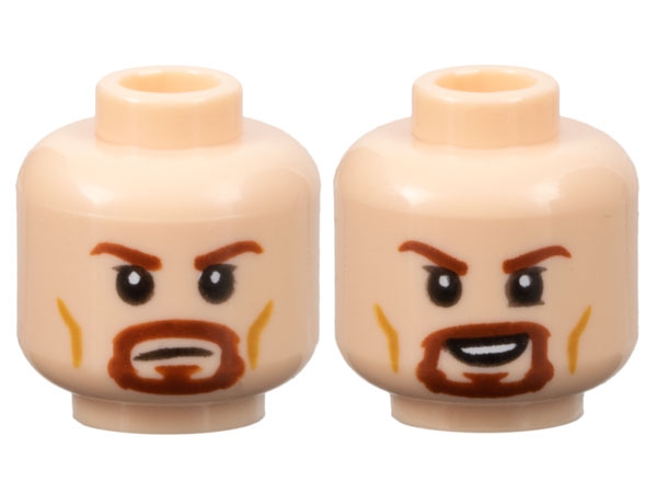 Minifigure, Head Dual Sided Reddish Brown Eyebrows and Goatee, Medium Nougat Cheek Lines, Neutral / Open Mouth Smile Pattern