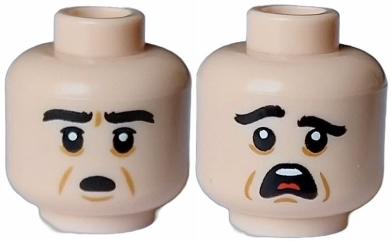 Minifigure, Head Dual Sided Black Eyebrows, Medium Nougat Cheek Lines, Open Mouth Scared / Terrified with White Teeth and Red Tongue Pattern