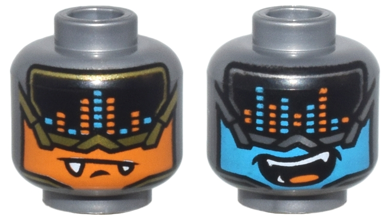 Minifigure, Head Alien Visor with Music Equalizer, Gold Trim, Orange Face, Fangs / Silver Trim, Dark Azure Face, Open Mouth Smile Pattern