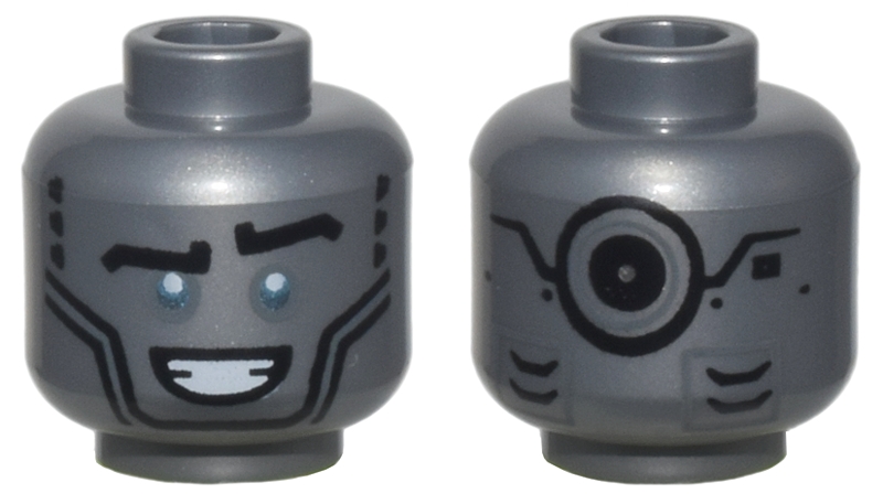 Minifigure, Head Alien Robot Black Eyebrows, Metallic Light Blue Eyes, Open Mouth Smile, and Black Circle and Mechanical Panels on Back Pattern