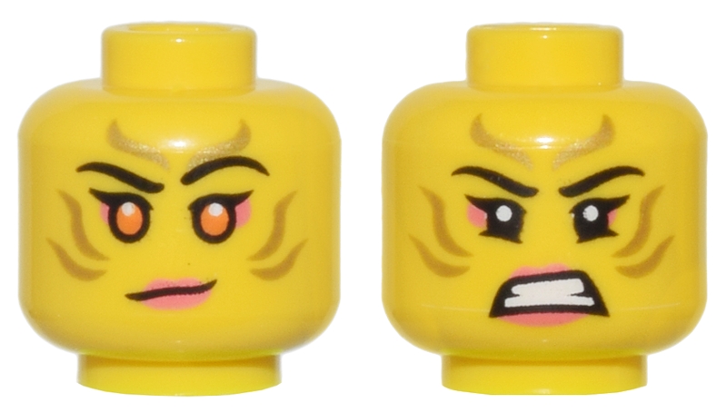 Minifigure, Head Dual Sided Female Gold Stripes Face Paint, Coral Lips and Eye Shadow, Orange Eyes, Lopsided Grin / Bared Teeth Pattern